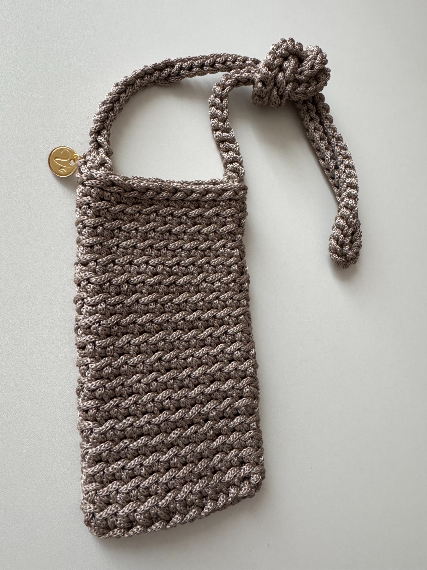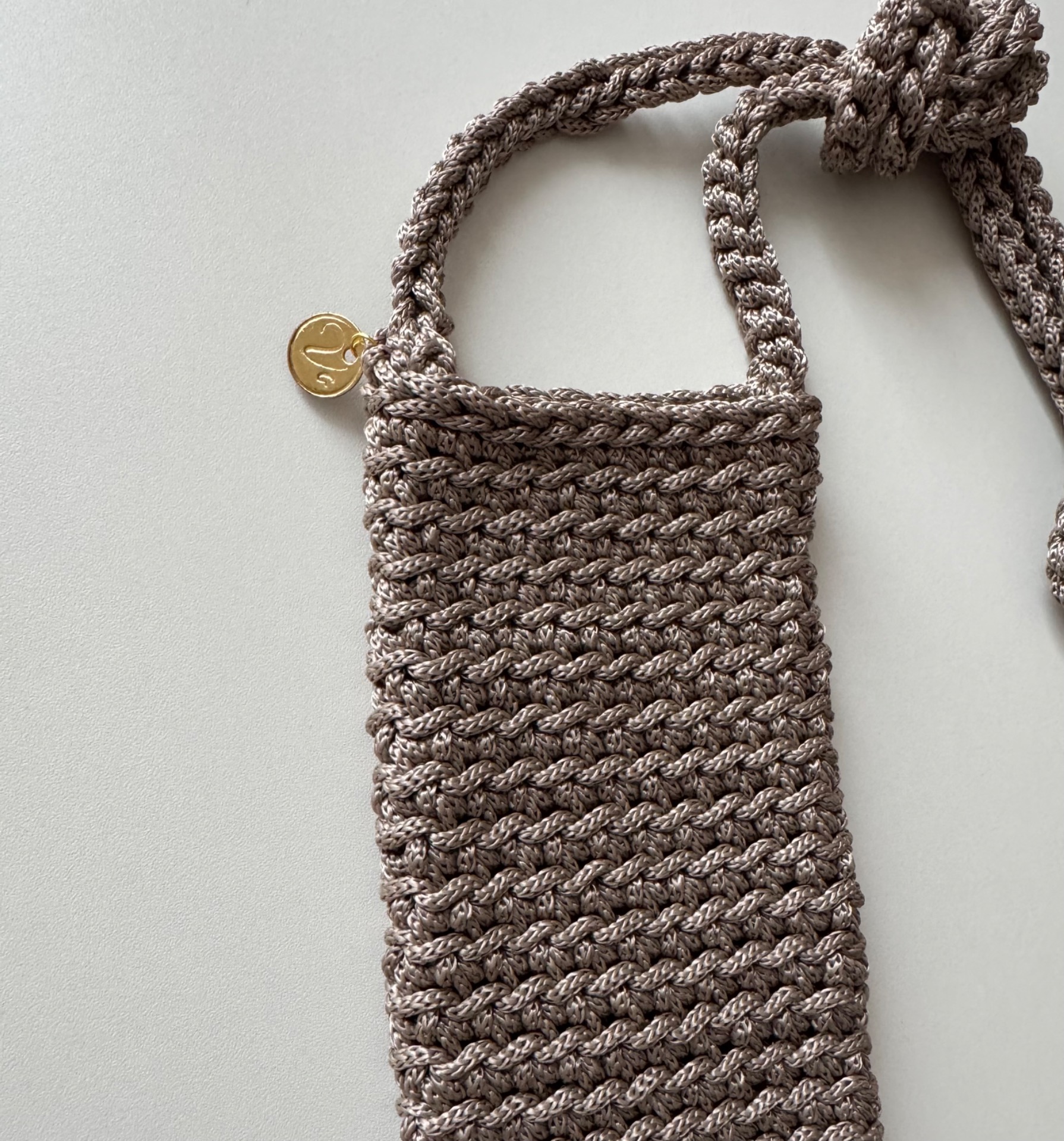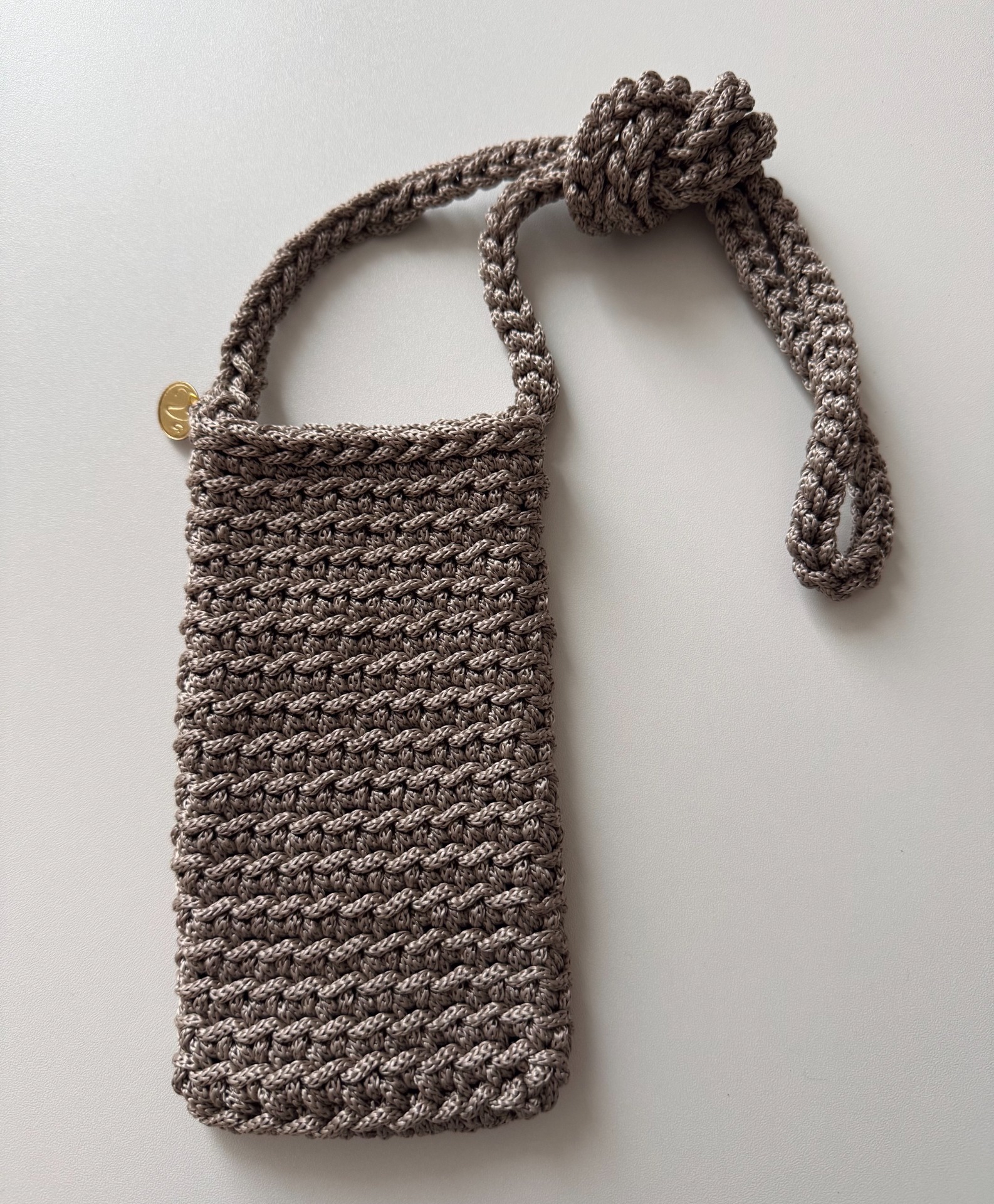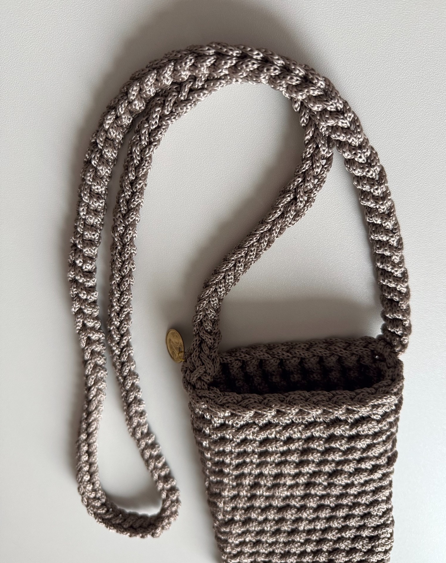 Stylová a praktická taštička na mobil ručně háčkovaná z kvalitní příze v elegantní šedobéžové barvě. Díky svému kompaktnímu tvaru a dlouhému popruhu je ideální na procházky nebo cestování – všude tam, kde potřebujete mít telefon stále po ruce a volné ruce zároveň.
