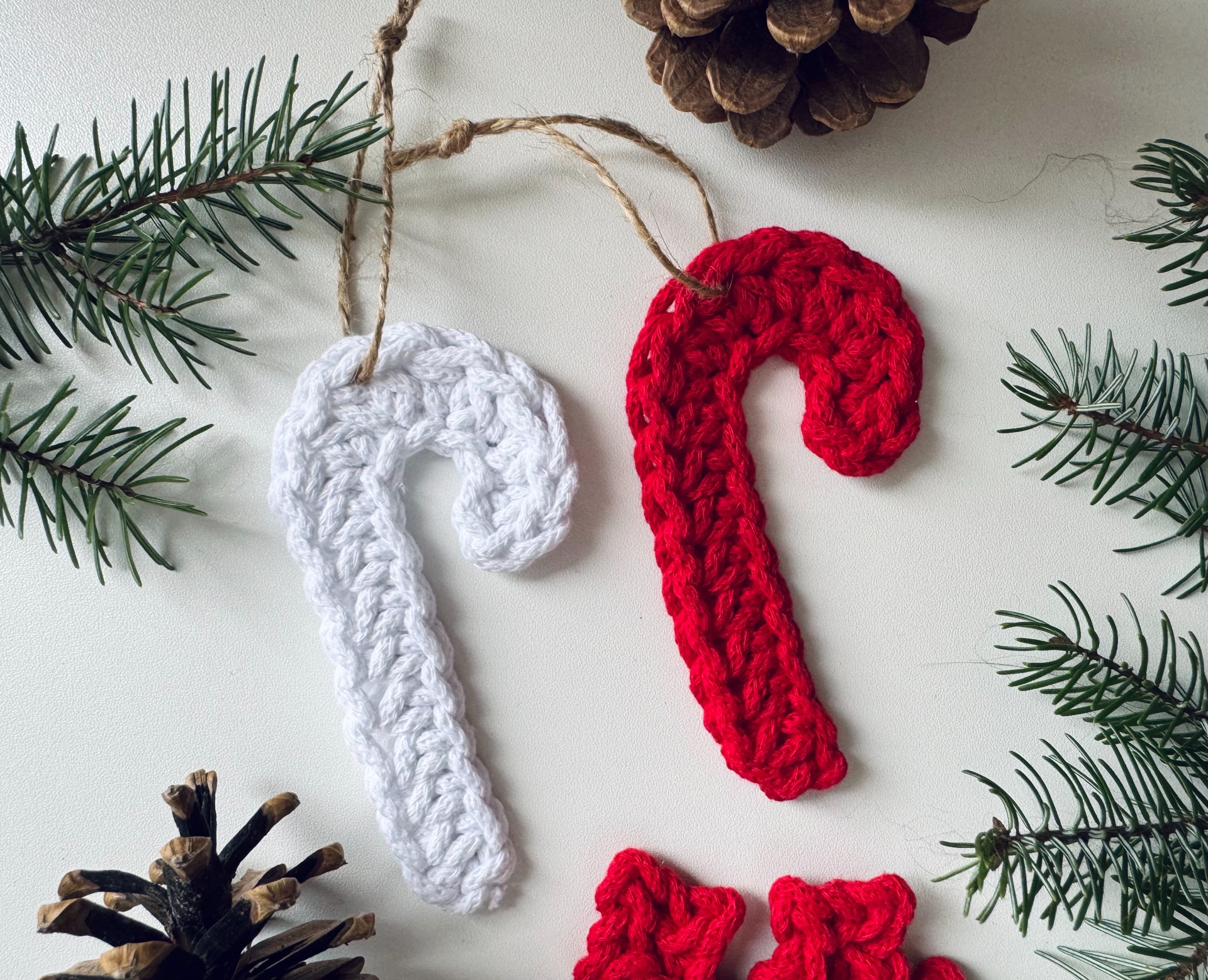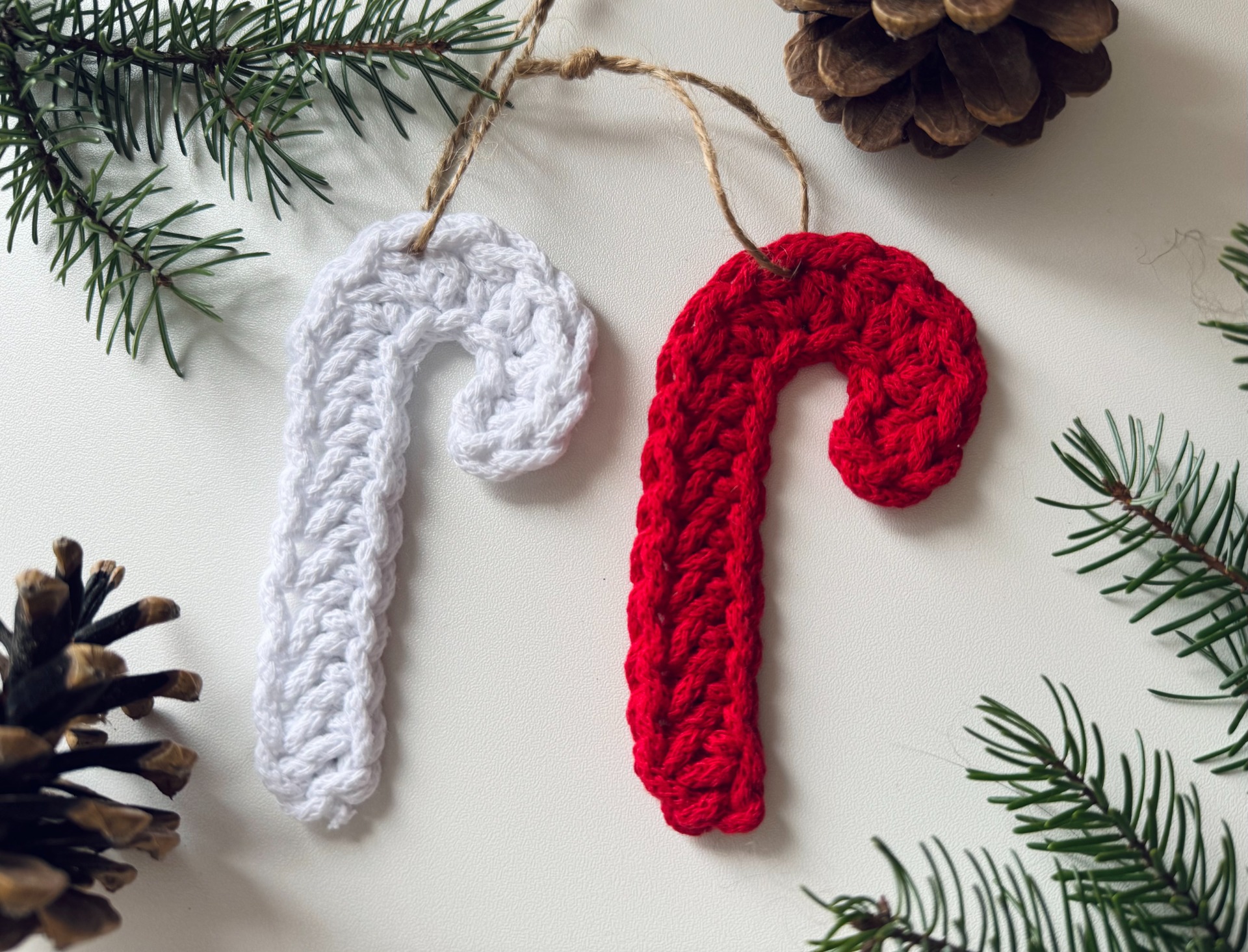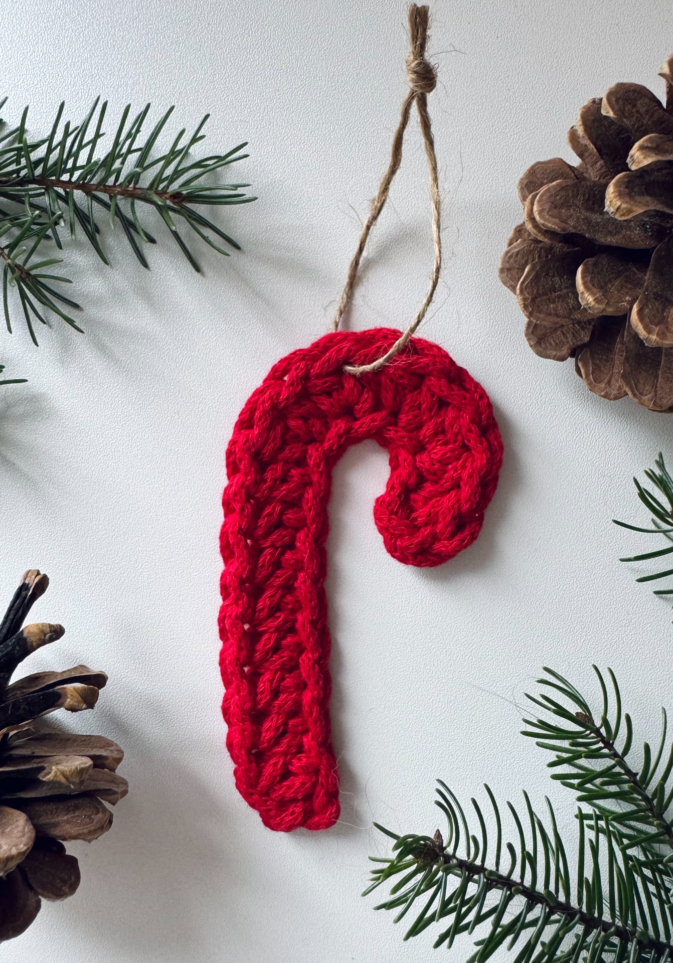 Ručně háčkovaná vánoční hůlka z příze Bobbiny – malý detail, který rozzáří stromeček i zabalený dárek. Každý kus je originál uháčkovaný s láskou k řemeslu.