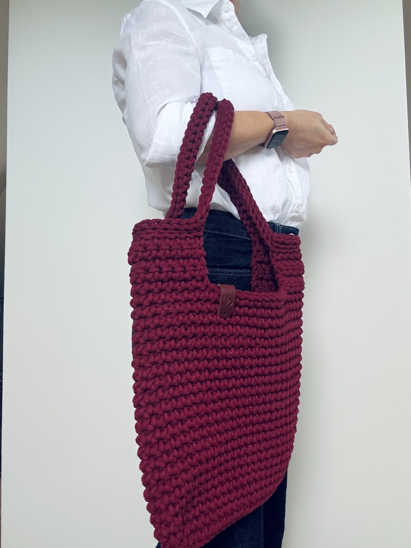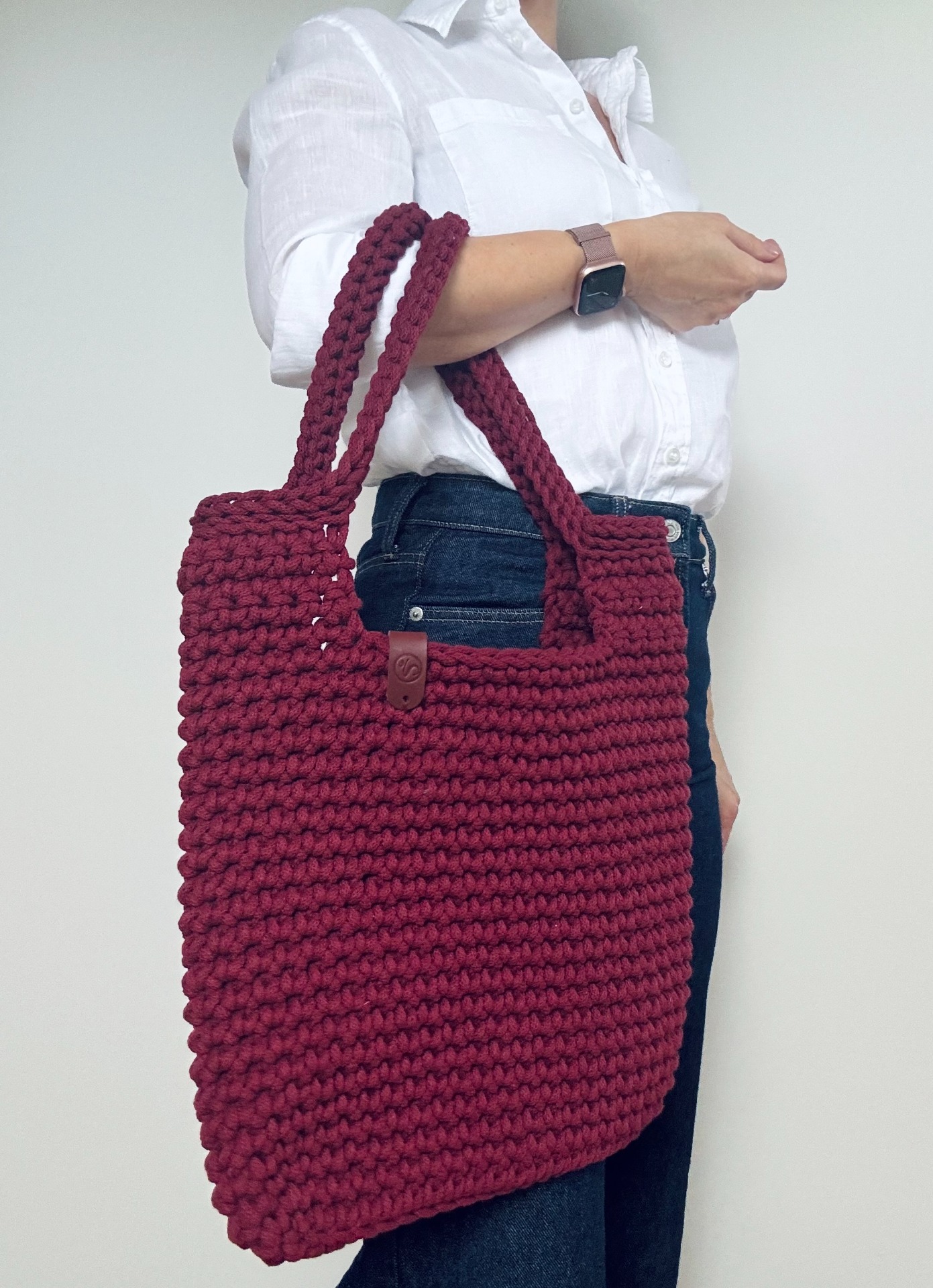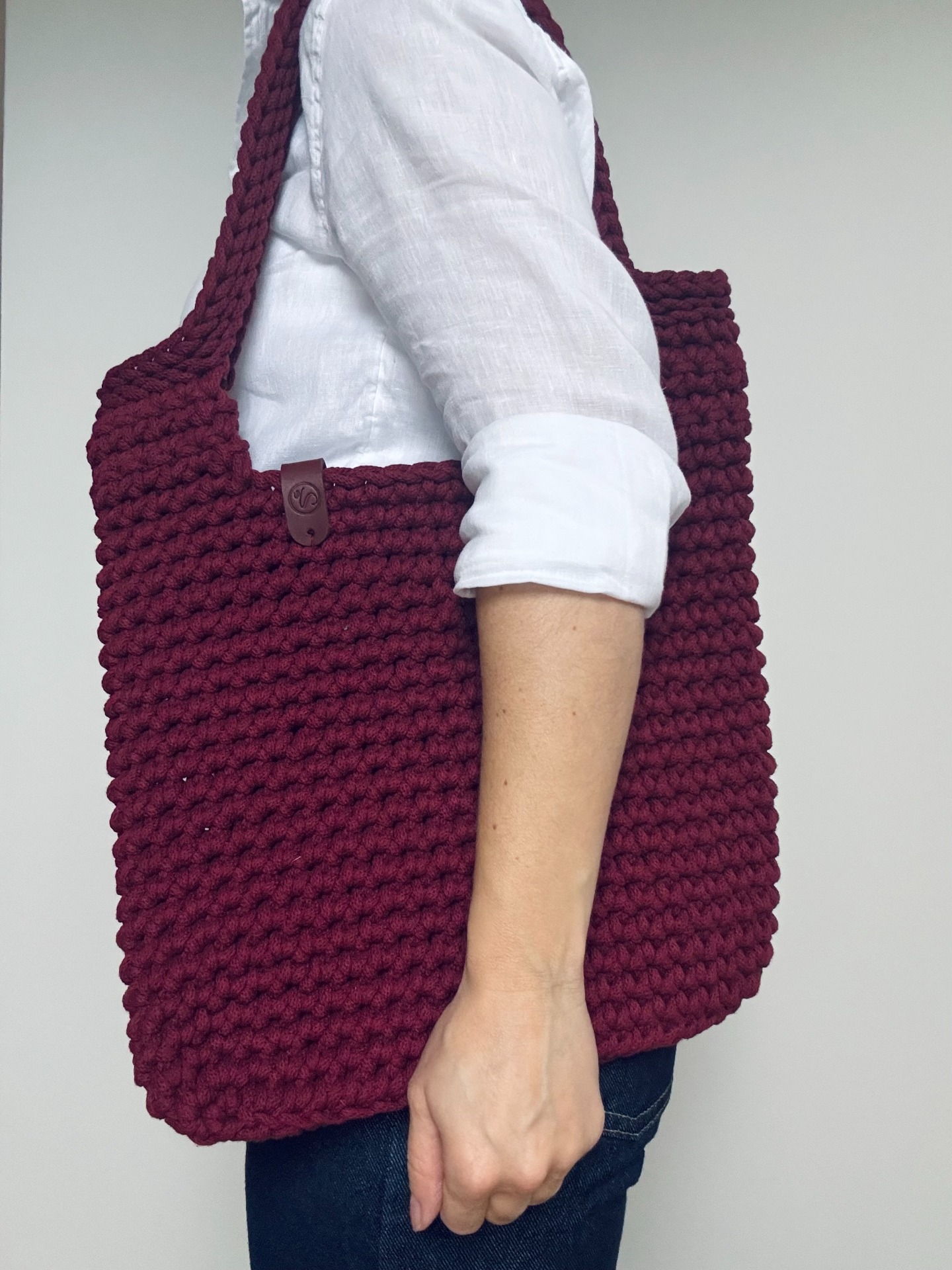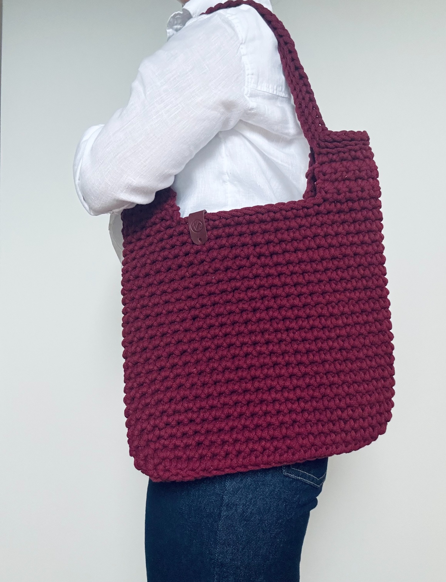 Vínová, ručně háčkovaná kabelka, která v sobě spojuje jemnost i sílu.